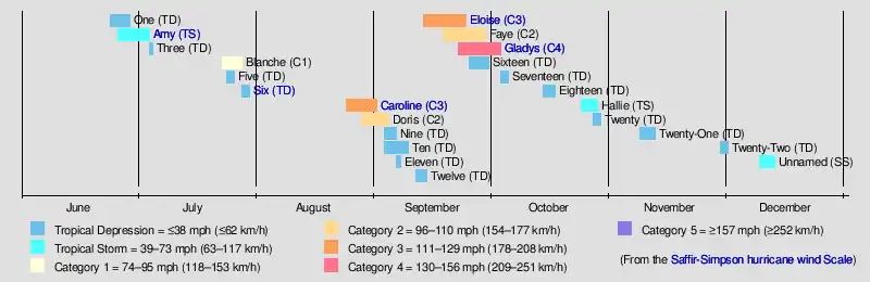 Tropical cyclogenesis began in June, with the development of a tropical depression on June 24, followed by Tropical Storm Amy on June 27. Four systems originated in July, including Hurricane Blanche. After Tropical Depression Six dissipated on July 30, tropical activity went dormant for over three weeks, ending with the development of Hurricane Caroline on August 24. Another cyclone, Hurricane Doris, also formed in August. September was the most active month of the season, featuring eight tropical cyclones, including hurricanes Eloise, Faye, and Gladys. In October, four systems formed, one of which intensified into Tropical Storm Hallie. Two tropical depressions developed in November. The last system, a subtropical storm, formed on December 6 and transitioned into an extratropical cyclone on December 13.[3]
