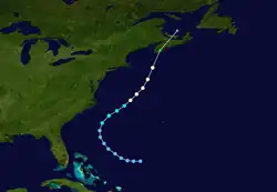 As the storm tracked to the east of the Bahamas, a curve to the north began, at which time an anticyclone developed atop the cyclone.[7] This subsequently allowed Gladys to rapidly intensify into a Category 4 hurricane, reaching maximum sustained winds of 140 mph (230 km/h) and a minimum barometric pressure of 939 mbar (27.7 inHg) on October 2. Thereafter, Gladys began to weaken and passed very close to Cape Race, Newfoundland, before losing tropical characteristics on October 3 while situated about 385 mi (620 km) northeast of St. John's.[3] Subsequently, the remnants merged with a large extratropical cyclone on October 3. Effects from the system along the East Coast of the United States were minimal, although heavy rainfall and rough seas were reported.[7] In Newfoundland, strong winds and light precipitation were observed.[29]