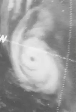 Doris made meteorological history when, on August 31, it became the first Atlantic hurricane ever to be upgraded to hurricane intensity solely on the basis of satellite pictures,[1] via the Dvorak technique.[7] The cyclone then curved northward and intensified further during the next few days, becoming a Category 2 hurricane early on September 2.[3] Based on the Dvorak technique, it is estimated that Doris peaked with maximum sustained winds of 110 mph (180 km/h) and a minimum barometric pressure of 965 mbar (28.5 inHg) shortly thereafter. By September 3, the hurricane began interacting with a non-tropical low pressure area.[7] On the following day, Doris quickly weakened to a tropical storm and transitioned into an extratropical cyclone about 830 mi (1,340 km) south-southeast of Cape Race, Newfoundland, around 06:00 UTC. The extratropical remnants weakened and then dissipated late on September 4.[3]