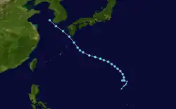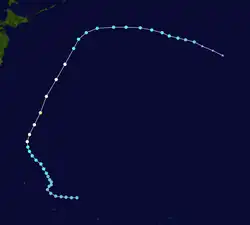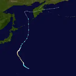 Typhoon Tess was first noted as a closed circulation on 1 September 600 nautical miles east-northeast of Saipan. The storm intensified over the next few days, becoming a typhoon on the 3rd. The cyclone reached its peak intensity on the 4th. Tess then weakened, losing typhoon status on the 8th, and dissipating over the Sea of Irkutsk on the 10th, being absorbed into a frontal system.[3]