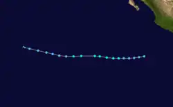 Late on August 23, an area of disturbed weather developed about 485 miles (781 km) south of Acapulco, Guerrero.[2] It rapidly coalesced into a tropical depression around 00:00 UTC the next day, but only slowly strengthened into Tropical Storm Iva by 18:00 UTC on August 25.[3] The system moved west and then west-northwest, further developing into a hurricane by 18:00 UTC on August 26 as a small eye became distinct.[2] Iva attained major hurricane strength late on August 27, further intensifying to its peak as a Category 4 hurricane with winds of 130 mph (210 km/h) around 06:00 UTC the following morning.[3] It oscillated in strength over the subsequent 24 hours, but ultimately began a steady weakening trend by August 30 while passing over marginal ocean temperatures.[2] Iva fell to tropical storm strength early that day, weakened to a tropical depression early on September 1, and dissipated around 00:00 UTC on September 2.[3]
