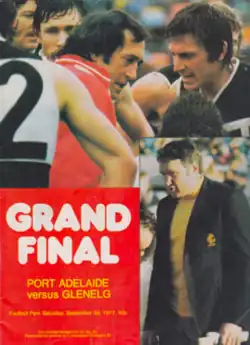 ![]() Official match program. Pictured top are Port Adelaide's John Cahill and Russell Ebert in discussion. Inset below is Glenelg coach John Nicholls. | ||||||||||||||||