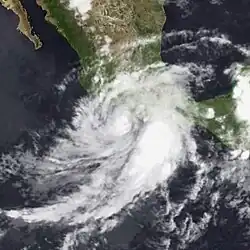 Tropical Storm Paul, the second system alongside Hurricane John without any genesis ties to the Atlantic,[4] was first identified north of Hurricane Olivia on September 22.[5] The system developed into a tropical depression by 00:00 UTC on September 23 but failed to intensify for several days thereafter. Finally, by 12:00 UTC on September 25, the system organized into Tropical Storm Paul.[6] It attained peak winds of 45 mph (72 km/h) six hours later as it curved toward the northeast, narrowly missing Baja California Sur.[5] Paul began to weaken as it approached the Mexico coastline, which it struck as a tropical depression around 12:00 UTC on September 26.[5] Six hours later, the depression transitioned into an extratropical cyclone,[6] which only persisted for an additional six hours before dissipating over northern Mexico.[5]