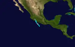 An area of disturbed weather and associated tropical wave was observed east of Acapulco on July 3.[4] It moved southwest during the early stages of its existence before curving more toward the northwest. Satellite imagery identified the existence of a tropical depression by 18:00 UTC on July 6,[5] and that depression quickly intensified into Tropical Storm Emilia six hours later. The newly named storm gathered strength over subsequent days, attaining peak winds of 65 mph (105 km/h) around 06:00 UTC on July 9.[6] Beyond that time, Emilia crossed into cooler waters and began to rapidly weaken,[5] dissipating after 18:00 UTC on July 10.[6]