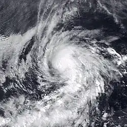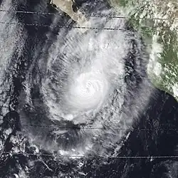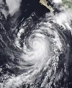 Two areas of disturbed weather focused south of the Gulf of Tehuantepec on October 1, one of which with origins as a tropical wave, underwent binary interaction and merged into one larger system the next day.[5] The disturbance was upgraded to a tropical depression around 18:00 UTC, and it further intensified into Tropical Storm Rosa by 00:00 UTC on October 3.[6] Rosa moved around the western periphery of an upper-level ridge,[5] strengthening over warm waters as it did so. The cyclone became a hurricane by 00:00 UTC on October 4, ultimately attaining peak winds of 85 mph (137 km/h) on October 4.[6] An aircraft reconnaissance plane intercepted the storm around this time, finding a 35 mi (56 km) elliptical eye open to the southwest.[5] Rosa moved northwest over colder waters, transitioning to an extratropical cyclone around 06:00 UTC on October 7 and ultimately dissipating west of Baja California after twelve hours.[5][6]