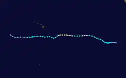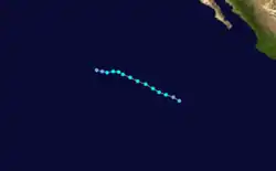 The season's second tropical cyclone began as a disturbance spawned by an African tropical wave southwest of the Mexico coastline on June 15.[4] It moved generally westward over very warm waters, and observations from satellite imagery and ships outlined the formation of a tropical depression by 00:00 UTC on June 17.[5] Six hours later, the depression intensified into Tropical Storm Bud.[6] Continued ship observations relayed Bud's intensification to a 60 mph (97 km/h) cyclone on June 18, but the storm weakened thereafter as it moved west-northwest under the influence of a ridge,[5] and it ultimately dissipated within the ITCZ after 06:00 UTC on June 26 while located over the open Central Pacific.[6][7]
