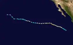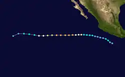 A small disturbance coincident with a tropical wave was first identified south of Acapulco on August 19.[4][5] The system moved west and coalesced into a tropical depression around 18:00 UTC on August 23.[6] The depression failed to intensify over subsequent days, and in fact, it was operationally downgraded back to a disturbance on August 26.[5] In the official database, the cyclone maintained its status and eventually intensified into Tropical Storm Miriam around 00:00 UTC on August 27.[6] Miriam turned west-southwest and entered the Central Pacific,[5] where it intensified into a hurricane at 12:00 UTC on August 28 and reached peak winds of 90 mph (140 km/h) twelve hours later.[6] Miriam then began to steadily weaken as it passed south of Hawaii,[5] and the cyclone dissipated after 00:00 UTC on September 2.[6]