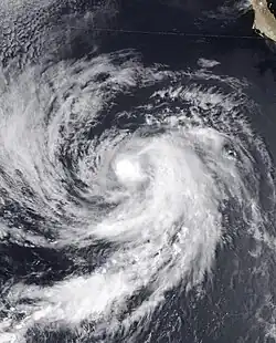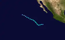 The final storm of the 1978 season began as a disturbance, with origins as an African wave,[4] southeast of Socorro Island on October 18.[5] The system moved northwest, developing into Tropical Storm Sergio at 18:00 UTC that day and reaching peak winds of 40 mph (64 km/h).[6] Sergio maintained this intensity until it began to curve northward into cooler waters,[5] which caused the system to transition into an extratropical cyclone by 00:00 UTC on October 21 and dissipate to the northwest of Baja California Sur after twelve hours.[5][6]
