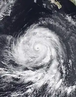 On August 29, a tropical wave and attendant disturbance were located southwest of Acapulco.[4][5] The system organized into a tropical depression by 18:00 UTC on August 30, and it became Tropical Storm Norman six hours later. Norman moved west-northwest while gaining strength,[6] intensifying into a hurricane around 06:00 UTC on September 1 and developing a small eye shortly thereafter. The hurricane rapidly intensified over warm waters,[5] catapulting to Category 4 intensity by 06:00 UTC on September 2. Norman peaked with winds of 140 mph (230 km/h) twelve hours later, equaling Fico and Hector as the strongest storm of the 1978 season.[6] A reconnaissance aircraft in the cyclone at this time observed a 45 mi (72 km) diameter eye.[5] High pressure steering the storm west-northwest gave way to strong southwesterly flow aloft, causing the storm to recurve northeast in a much less favorable environment. Subsequent recon missions found a much weakened cyclone,[5] and Norman ultimately dissipated south of San Clemente Island after 00:00 UTC on September 7.[6]