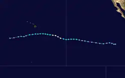A tropical disturbance, first identified in association with a tropical wave west of Nicaragua on June 24,[4][5] moved west-northwest and organized into a tropical depression by 18:00 UTC on June 26.[6] It intensified into Tropical Storm Daniel within twelve hours but weakened to a tropical depression again while tracking over 26 °C (79 °F) ocean waters. After moving into warmer waters again,[5] Daniel regained tropical storm strength before 18:00 UTC on June 28 and intensified into a hurricane 24 hours later. Around 12:00 UTC on June 30, the hurricane attained major hurricane strength with winds of 115 mph (185 km/h).[6] The cyclone tracked west and then west-southwest over steadily cooler waters,[5] which resulted in its weakening and degeneration to a disturbance after 18:00 UTC on July 3.[6] The remnant system moved across the Central Pacific and through the Hawaiian Islands, where it lost definition on July 11.[7]