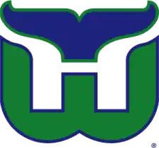 Hartford Whalers logo introduced in 1979, designed by Peter Good, a Connecticut-based graphic designer. This logo replaces the harpoon by combining a green W for Whalers with a blue whale's tail. The negative space--the white area between the W and the whale's tail--acts as an H for Hartford.