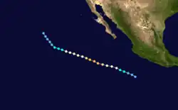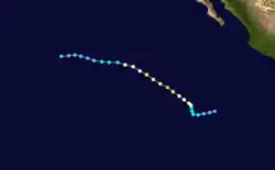 A tropical disturbance south of Acapulco developed into a tropical depression on September 16 and a tropical storm later that day. Kay headed in an irregular but generally west-northwest path out to sea. Kay strengthened into a hurricane on September 17. It continued strengthening and reached its peak as a Category 4 hurricane on the Saffir–Simpson scale on September 18. Kay then slowly weakened and was a tropical storm by September 20. Kay's forward motion slowed as it neared the central Pacific. It restrengthened into a hurricane on September 23, crossed 140°W, and entered the Central Pacific Hurricane Center's area of responsibility the next day.[2] Kay executed a small anticyclonic loop, and then began weakening again. It became a tropical storm again on September 27, and a depression two days later. The cyclone dissipated on September 30 while located north of the Hawaiian Islands.[4] Kay did not effect land, causing no damage or casualties.[2] It was the strongest tropical cyclone of the season at 140 mph (225 km/h). Kay lasted for 14.5 days, enough to make it the fifth-longest-lasting Pacific hurricane at the time.[4]