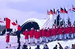 The Lake Placid Games took place in the shadow of the Cold War with a number of other complex international events occurring in the lead up to the games. In November 1979, Sixty-two Americans were taken hostage at the United States Embassy in Tehran by Iranian militants, a situation that would not resolve until after the Games.[16] In December 1979, the Soviet Union began the invasion of Afghanistan, which led to United States President Jimmy Carter calling for the international boycott of the 1980 Summer Games in Moscow.[16] The Western governments first considered the idea of boycotting the Moscow 1980 Summer Olympics in response to the situation in Afghanistan at the 20 December 1979 meeting of NATO representatives. The idea was not completely new to the world: in the mid-1970s, proposals for an Olympic boycott circulated widely among human rights activists and groups as a sanction for Soviet violations of human rights.[17] At that time, very few member governments expressed interest in the proposal. However, this idea gained popularity in early January 1980 when Soviet nuclear scientist and dissident Andrei Sakharov called for a boycott. On 14 January 1980, the Carter Administration joined Sakharov's appeal and set a deadline by which the Soviet Union must pull out of Afghanistan or face the consequences, including an international boycott of the games. On 26 January 1980, Canadian Prime Minister Joe Clark announced that Canada, like the US, would boycott the Olympic Games if Soviet forces did not leave Afghanistan by 20 February 1980.[18] Carter also proposed moving the Olympics to Greece on a permanent basis to eliminate the issue of politicisation of the Games' hosting, but the International Olympic Committee (IOC) rejected this idea.[19] Ultimately, 66 nations would boycott the 1980 Summer Olympics, but this did not impact the Lake Placid Games.