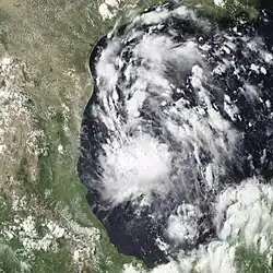 A tropical disturbance moved across the Caribbean sea between July 20 and July 24 before moving across the Yucatán peninsula.[40] After emerging into the south-central Gulf of Mexico, the disturbance organized into a tropical depression early on July 25. The depression moved west-northwest into northeast Mexico on July 26 before its surface circulation dissipated. Heavy rains fell across western Texas, Oklahoma, and Arkansas when the remains of this system interacted with a stationary front across the southern Plains between July 28 and July 30.[8]
