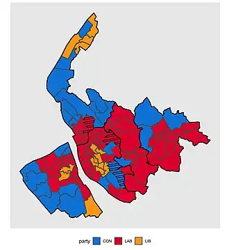 ![]() Map of Merseyside County Council showing wards won by party[2] | |||||||||||||||||||||||||||||||||||||||||
