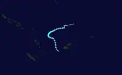 The system that was to become Tropical Cyclone Kina was first noted on November 6, while it was located just to the east of Tuvalu.[11][12] Over the next few days the system moved south-westwards and gradually developed further, before the JTWC reported that the system had developed into a tropical cyclone, with peak 1-minute sustained winds of 75 km/h (45 mph) during November 10.[12] During that day the FMS also reported that the system had developed into a Category 1 tropical cyclone on the Australian Scale and named it Kina.[11][12] The FMS subsequently estimated during the next day that the system had reached its peak intensity, with 10-minute sustained winds of 75 km/h (45 mph) during November 11.[11][12] Later that day the system's upper-level circulation became sheared off from its lower and moved southwards away from it.[11] The degenerating system subsequently passed to the west of Fiji during November 13, before it was last noted during November 16, as it passed over the island of Efate in Vanuatu but no damage was reported.[12][13] The system caused strong winds and rough seas on Viti Levu and in the Yasawas and Mamanutha group of islands.[11] Tourists on the Blue Lagoon Cruise in the Yasawas were forced to take shelter from Kina, while 18 people on another boat were temporarily listed as missing as they took shelter.[11]