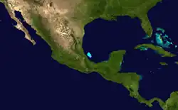 An upper-level low-pressure area traversing the southern Gulf of Mexico spawned convective activity over the Isthmus of Tehuantepec on June 16. This convective area waxed and waned somewhat in intensity, until becoming a larger disturbance on June 18. A surface low soon formed,[23] and around 12:00 UTC that day, the system developed into a tropical depression over the Bay of Campeche.[20] With vertical wind shear preventing significant further intensification,[23] the depression made landfall near Tampico, Tamaulipas, with winds of 35 mph (55 km/h). The depression quickly dissipated over the mountainous terrain of eastern Mexico.[20] The cyclone and its precursor dropped heavy rainfall in some areas, including a peak total of 11.43 in (290 mm) of precipitation in San Lucas Ojitlán, Oaxaca.[23]
