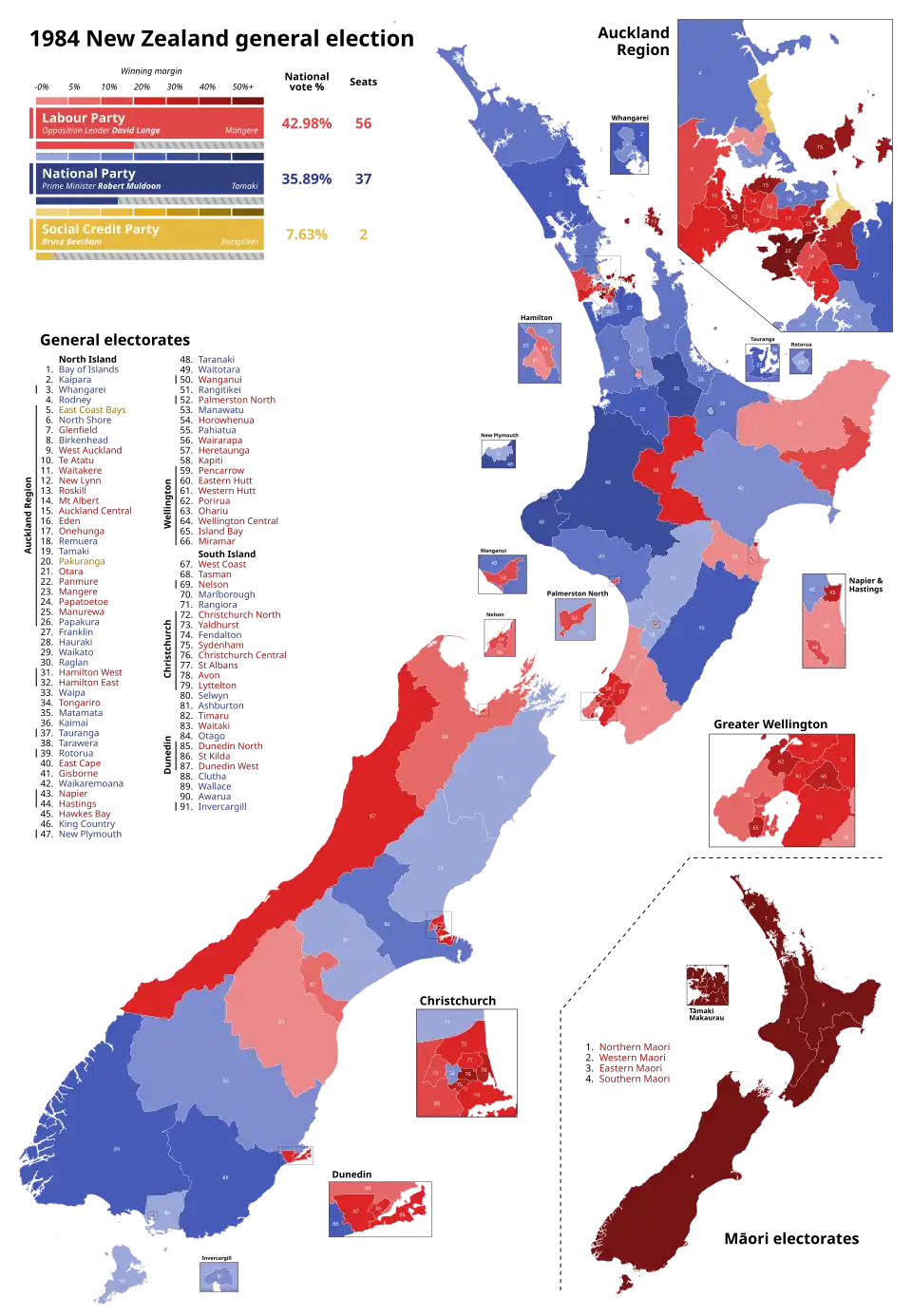 The Labour Party, previously in opposition, won 56 seats, an outright majority. Most of the seats won by Labour were in urban areas, following the party's typical pattern. Exceptions to this general trend include the eastern tip of the North Island and the western coast of the South Island. Labour's strongest regions were the Wellington area (where the party won every seat), as well as theWestern and Southern areas of Auckland where most of the poorest lived, Christchurch and Dunedin (cities in which it won most seats). Smaller cities such as Hamilton, Nelson, Napier, Hastings and Palmerston North were also won by Labour. As expected, Labour also won all four Māori seats, maintaining its traditional strength there.