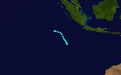 The precursor tropical low to Cyclone Uma formed within the region on 4 February, before it crossed 160°E and moved into the South Pacific basin later that day.[4] The precursor tropical low to Cyclone Veli formed during the next day, about 725 km (450 mi) to the south-east of Port Moresby in Papua New Guinea.[4] During the next day, the low moved eastward and gradually developed further, before it became equivalent to a category 1 tropical cyclone on the Australian scale, as it reached its 10-minute sustained windspeeds of 85 km/h (55 mph).[4] As the system continued to move eastwards it crossed 160°E and moved into the South Pacific basin during 7 February, before TCWC Nadi named it Veli later that day on the basis of satellite derived evidence.[4][5]