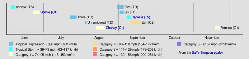 The season started on June 5 when Subtropical Depression One formed near the Bahamas, which would later gain tropical characteristics and become the first tropical storm of the season; Tropical Storm Andrew. On June 9, Andrew would later be absorbed by a larger low pressure system. On June 23, the season's first hurricane formed; Bonnie, although it attained hurricane status on June 25, just two days after Bonnie's formation. Two more tropical depressions followed suit later in the season. On August 13, the season's fifth tropical depression formed and would later become Hurricane Charley four days later. After Charley dissipated, two more tropical depressions formed on August 31 and September 1. Both dissipated on September 4. On September 7, Tropical Storm Danielle formed and would dissipate on September 10. Just after Danielle dissipated, Hurricane Earl formed and would later become the strongest system of the 1986 Atlantic hurricane season, peaking as a 105 mph Category 2 hurricane and 979 mbars in lowest pressure. No tropical cyclones formed during the months of October and the first half of November. That is, until Hurricane Frances became the latest sixth named storm on record since tropical cyclones were first named in 1950. The season came to a close on November 21, which was when Frances dissipated.