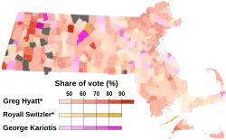 | Worcester | 63.1% | 122,216 | 32.7% | 63,373 | 4.2% | 8,141 | 193,730 |