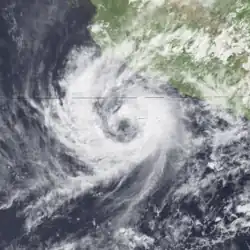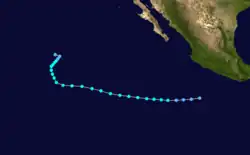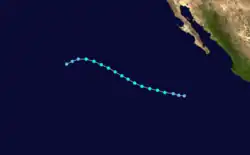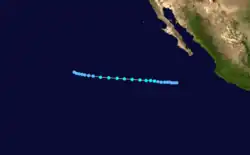 A tropical disturbance developed on September 27 within 250 mi (400 km) of the Mexican coastline.[2] The disturbance was upgraded into Tropical Depression Twenty-Three on 0000 UTC September 28. Tropical Depression Twenty-Three moved west-northwestward, lured poleward by an upper-level trough near northern Mexico. At 0000 UTC September 30, the depression became Tropical Storm Paine, southwest of Acapulco. Roughly 21 hours later, a NOAA Hurricane Hunter flight found winds of 90 mph (140 km/h), upgrading Paine into hurricane. The hurricane peaked as a Category 2 hurricane on October 1 as it turned northwest, headed towards the Gulf of California. Hurricane Paine did not intensify further due to the presence of mid-level wind shear and dry air.[2] The outer eyewall moved across Cabo San Lucas, and the resultant land interaction was believed to have slightly weakened the inner core of the hurricane.[31] Paine moved ashore near San José, Sonora with winds of 100 mph (160 km/h). The storm weakened as it moved over land going through Mexico and then entering the United States. Paine dissipated on October 4 over Lake Michigan.[2][32]