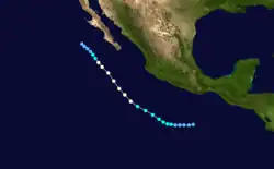 Activity in the Eastern Pacific Hurricane Center's (EPHC) area of responsibility was above average. There were 25 tropical depressions, one short of the record set in 1982, which had 26.[2] Only one system formed in the Central Pacific Hurricane Center's (CPHC) area of responsibility, and six others entered the CPHC area of responsibility from the EPHC area of responsibility.[3] In all, 17 systems formed, which is two storms above normal. In addition, 9 hurricanes were reported during the season, one more than average. An average number (3) of major hurricanes – Category 3 or higher on the Saffir-Simpson hurricane wind scale—was also reported.[4][5]
