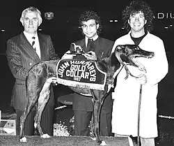 The kennel of Gary Baggs contained Puppy Derby champion Spiral Darkie, in addition to Fifty Pence, Fiddlers Run, Signal Spark and Karens Champ. Signal Spark emerged as the star when winning the 1987 English Greyhound Derby. Signal Spark was then transferred to Ernie Gaskin following a well-documented dispute between Gary Baggs and owner Towfiq Al-Aali, resulting in the latter removing his dogs from the Walthamstow trainer.[18] Fred Wiseman also had a strong kennel including Scurry champion Rapid Mover, head man John McGee was credited for much of the success from the kennel.[15][16] Signal Spark was voted Greyhound of the Year.[17]