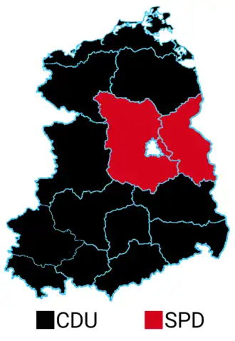 Saxony-Anhalt 933,276 44.5 496,606 23.7 293,605 14.0 50,393 2.4 161,580 7.7 46,255 2.2 37,696 1.8 36,978 1.8 12,650 0.6 7,351 0.4 9,402 0.4 3,410 0.2 6,053 0.3