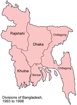 In 1990, Bangladesh was administratively divided into 4 divisions, namely Dhaka, Chittagong, Khulna and Rajshahi which were further subdivided into a total of 64 districts (See List of districts of Bangladesh). The government of under Begum Khaleda Zia chose to change the upazila system and set up instead democratically designed decentralised structures at the appropriate levels.[3] In 1993, Barisal Division was split off from Khulna Division and in 1995, Sylhet Division was split off from Chittagong Division. By the end of the decade, the number of divisions stood at 6.