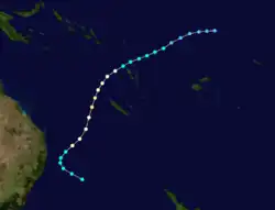 On February 24, a shallow tropical depression developed within the monsoon trough of low pressure, about 370 km (230 mi) to the northeast of Port Vila, Vanuatu.[35] Over the next day the system moved south-westwards and gradually developed further, before it passed over northern Vanuatu between February 25–27.[35][11] During February 26, the JTWC and the FMS reported that the depression had developed into a tropical cyclone, with the latter naming it as Easu, while it was located to the east of Espiritu Santo in Vanuatu.[13][35] Throughout that day as Esau intensified further, it moved south-westwards and away from the islands of Vanuatu.[35] Esau subsequently accelerated westwards to the north of an intense subtropical ridge of high pressure and gradually intensified further as it moved into an area of decreasing vertical windshear.[1] During February 28, the FMS subsequently reported that the system had peaked as a category 4 severe tropical cyclone with 10-minute sustained wind speeds of 185 km/h (115 mph).[1][36] The system subsequently moved into the Australian region and brought gale-force winds to the Solomon Islands during February 29.[1] The JTWC also reported that Esau had peaked with 1-minute sustained wind speeds of 240 km/h (150 mph), which made it equivalent to a category 4 hurricane.[36] Over the next few days the system moved south-eastwards and back into the South Pacific basin, under the influence of a northwest steering flow and threatened the southern islands of Vanuatu.[35] The system subsequently came to within 450 km (280 mi) of southern Vanuatu before turning southwards and threatening the French overseas territory of New Caledonia.[35] The system made landfall on the French territory of New Caledonia during March 4, as a category 3 severe tropical cyclone.[35] As a result of passing over the mountainous island nation and increasing vertical wind shear, the system transitioned into an extratropical cyclone over the cooler waters of the Tasman Sea.[35] The extratropical remnants of Cyclone Esau subsequently made landfall on New Zealand's North Island during March 8, before they were last noted during the next day over the South Pacific Ocean.[37]
