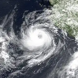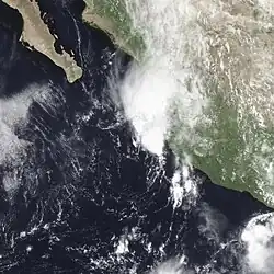 On November 7, an area of convection associated with a tropical wave developed into a tropical depression, while located about 560 mi (900 km) to the southeast of Acapulco, Mexico.[42] During that day the depression moved towards the northwest, intensified into a tropical storm and was named Nora later that day.[43][44] On the next day, the storm gradually intensified further while temporarily moving towards the west, due to the flow field around a strengthening high pressure system located to the north of Nora.[1] After developing an eye, Nora intensified into a hurricane.[42][45]