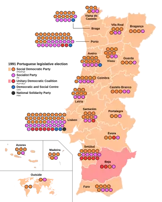 The 1991 Portuguese legislative election took place on 6 October. The election renewed all 230 members of the Assembly of the Republic. There was a reduction of 20 seats compared with previous elections, due to the 1989 Constitutional revision.[1] For the first time in Portuguese democracy, an election was held after the four years of the legislature had been fully completed.[2]