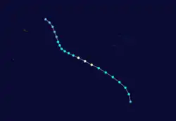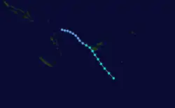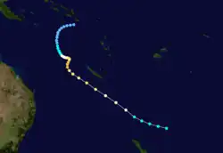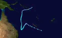 Developed in the Australian region of the Coral Sea far offshore from Queensland. The cyclone intensified to a Category 3 severe tropical cyclone (Australian intensity scale) before crossing into the South Pacific region where it passed to the southwest of New Caledonia.[17]