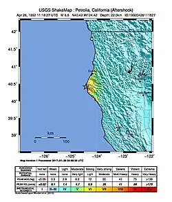 The region near the triple junction experiences high seismicity, with more than 60 earthquakes of intensity VI (Strong) or greater or magnitudes ≥ 5.5 since 1853. The mainshock in the sequence (11:06 a.m. Pacific Daylight Time) occurred onshore, 4 kilometers (2.5 mi) west of Petrolia at a depth of 10.5 kilometers, and was among an infrequent number of earthquakes with fault-plane solutions that conveyed evidence of slip at the Cascadia subduction zone. While the focal mechanism indicated slip on a thrust fault striking N.10°W with a shallow dip of 13° to the east-northeast, the rupture most likely propagated to the west, based on the mainshock location at the southeastern boundary of the aftershock zone. Investigation of more than 1,200 surveys from the North Coast area led to the assignment of an intensity rating of IX (Violent) on the Modified Mercalli scale for the region near Petrolia.[8]