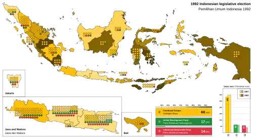 Legislative elections were held in Indonesia on 9 June 1992, to select 400 of the 500 members of the People's Representative Council (DPR).[a] The election was the sixth legislative elections since Indonesian independence and the fifth legislative elections under the New Order regime of president Suharto. The election resulted in a clear victory for Golkar, which retained its status as the ruling party, although the opposition, under the United Development Party (PPP) and the Indonesian Democratic Party (PDI), saw their vote shares rise.