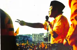 Under the leadership of Wahono, who had been elected chairman of Golkar in the 1988 Golkar National Conference,[9] Golkar's largest challenge ahead of the 1992 elections, was in retaining its large 73.11% victory it had received in 1987. Its biggest threat to accomplishing this goal was the PDI, under the leadership of Suryadi, which had begun to increasingly use the symbols of former president Sukarno to gain support.[10] Golkar's 1992 campaign began with a kick-off rally in Surabaya, East Java, to excite and get out the vote for Golkar. During the campaign, Golkar mainly campaigned on stability and the economy, with party spokesman and former party vice chairman Sarwono Kusumaatmadja arguing that it was difficult to bring about change without risking the unity of the nation, and that the priority of the nation should be to build a strong economic basis.[11]