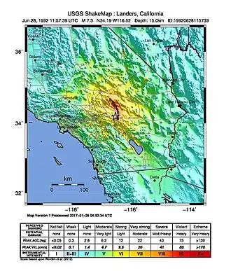 The 1992 Landers earthquake occurred on Sunday, June 28 with an epicenter near the town of Landers, California, in San Bernardino County.[5] The shock had a moment magnitude of 7.3 and a maximum Mercalli intensity of IX (Violent).[3]
