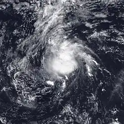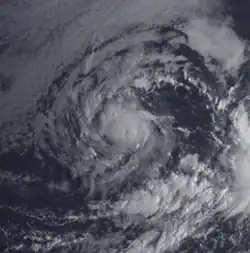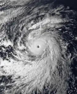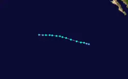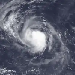 The system continued intensifying until reaching hurricane status at 00:00 UTC on January 30, and it reached major hurricane status on February 2, reaching maximum sustained winds of 115 mph (185 km/h).[7] However, unfavorable wind shear began taking a toll on the storm, causing it to rapidly weaken. Ekeka crossed the International Date Line as a weakened tropical storm, and shortly thereafter degraded to tropical depression status. Ekeka continued westward, passing through the Marshall Islands and later over Chuuk, before dissipating on February 9 about 310 mi (500 km) off the north coast of Papua New Guinea.[6]