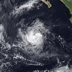 The origins of Hurricane Estelle were from a tropical wave that began on June 23 off the African coast.[29] After passing over northern South America, a large area of disturbed weather formed about 460 mi (740 km) west of Acapulco on July 9 and was classified as a tropical depression two days later. Eighteen hours later, the depression strengthened into Tropical Storm Estelle[29] as banding features increased.[30] Gradually intensifying, the storm's outflow improved,[31] and a burst of deep convection occurred over the center.[32] Early on July 10, an eye developed, and based on this, Estelle was upgraded into a hurricane. Around that time, Estelle turned to the northwest.[29]