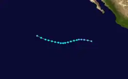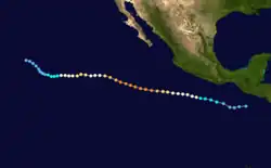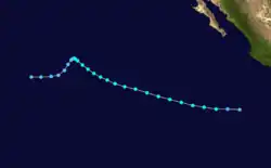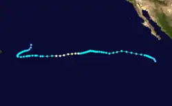 During the season, twenty-seven tropical cyclones formed in the Eastern Pacific (east of longitude 140°W), and twenty-four developed further and became tropical storms. Both of these figures constitute records in the basin, as the 1992 season surpassed the season with the most tropical cyclones (1982, 26) and the season with the most named storms (1985, 22). Of these, fourteen reached hurricane strength and eight became major hurricanes—storms that reach Category 3 or higher on the Saffir-Simpson Hurricane Scale.[5]