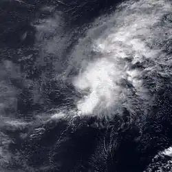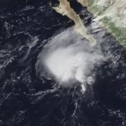 A tropical wave crossed Central America from June 14–16. The system entered the Eastern Pacific basin without much convection. The northward portion of the wave developed a circulation in the mid-levels of the atmosphere, and despite moving over waters marginally suitable for cyclogenesis, the tropical wave organized into the fourth depression of the season on June 22[13] as deep convection developed near the center.[14] At this time, the system was located 460 mi (740 km) south of the southern tip of the Baja California Peninsula.[13] Early on June 23, the depression intensified into Tropical Storm Blas. Although the storm developed an impressive upper-level outflow and well-organized thunderstorm activity and was moving into an area sea surface temperatures of 78 °F (26 °C), the National Hurricane Center (NHC) forecast only slight intensification.[15] Water vapor imagery also suggested that strong wind shear would introduce a weakening trend,[16] and later that day, Blas weakened accordingly back into a depression, and dissipated at 00:00 UTC June 24.[13]
