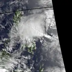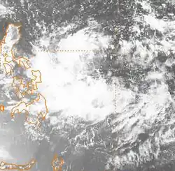 On May 14, an area of deep convection associated with a weak cyclonic circulation near Kosrae was mentioned in the JTWC's 0600 UTC Significant Tropical Weather Advisory. For the next five days, this weak circulation tracked west-northwestward in the direction of Guam, before turning to the west-southwest, but convection failed to consolidate near the centre during this time.[15] After passing close to Palau on May 21, it turned northwest and entered the Philippine Sea, and was named Deling by PAGASA early on May 23 local time. Shortly after, SSM/I imagery indicated the presence of a well-defined low-level circulation centre, and visible and infrared satellite images indicated an increase in organisation of the system and a consolidation of deep convection near the centre. Based on this, a Tropical Cyclone Formation Alert was issued by the JTWC at 0600 UTC.[15]