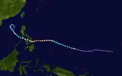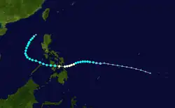 Owen continued to strengthen, with the JMA classifying it a severe tropical storm on April 3.[7] According to the JTWC, Owen reached typhoon intensity at the same time the JMA classified it a severe tropical storm. The storm tracked southwest to west-southwestward, and reached its peak intensity of 75 knots (139 km/h) from the JTWC (60 knots (110 km/h) from the JMA) on April 4, shortly before landfall between Leyte and Mindanao.[6] A reading taken late on April 3 at Guiuan on Samar reported sustained winds of 45 knots (83 km/h).[4] It weakened to a tropical storm overland, before it restrengthened slightly after emerging into the South China Sea. A drilling rig reported 50 knots (93 km/h) sustained winds. Soon afterwards, the cyclone dissipated over water northwest of Luzon on April 9.[6]
