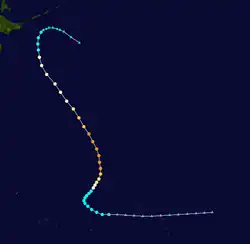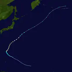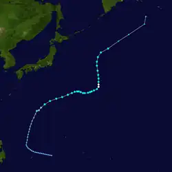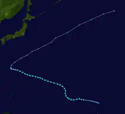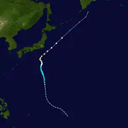 Page moved on a northwestward track for the next couple days while slowly strengthening.[11] Page was upgraded to a tropical storm by the JTWC late on May 12,[12] when it was located 500 kilometres (310 mi) north of Yap,[4] while the JMA first considered the system a tropical storm on May 13.[7] Late on May 13, Page suddenly slowed in forward speed and began turning to the northeast. On May 14, Page became a typhoon.[11][12] However, the JMA did not follow suit until 30 hours later.[7] Page reached its maximum intensity of 90 knots (170 km/h) and minimum pressure of 965 hectopascals (28.5 inHg) thirty hours after passing the point of recurvature.[11] Final warnings were issued by both the JTWC[11] and the JMA[7] early on May 18, as it began extratropical transition around 960 kilometres (600 mi) east-southeast of Tokyo.[11]