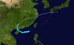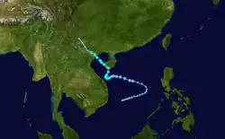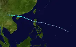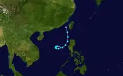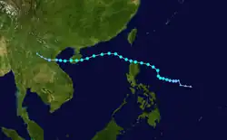 The first warning was issued a day later when the amount of deep convection near the centre increased as the depression neared the Philippines. While over the Philippine islands, a large mesoscale convective system (MCS) developed near the centre of the tropical depression, something that would occur again later while the system was west of Luzon.[15] Soon after the second MCS weakened, the system made landfall in central Vietnam on May 26, and quickly dissipated when inland.[4] The Hong Kong Observatory tracked this system as a weak tropical depression from May 25 UTC when it was about 520 km (320 mi) southeast of Xisha for about 24 hours before it dissipated.[1]