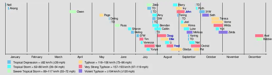 The season started on January 4 with the formation of Tropical Depression 01W to the west of Yap, with the first tropical storm developing a few months later on April 1, and ended near the end of the year when Tropical Storm Bobbie dissipated in the open Pacific on December 25. During the season, 25 systems either threatened land or made landfall, killing over 2,400 people. The strongest storm of the season was Super Typhoon Doug, which affected Taiwan, South Korea and mainland China, while the deadliest storm was Super Typhoon Fred, which killed over 1,000 people in China. Earlier in the season, the combined effects of two tropical storms —Russ and Sharon —caused flooding in China that killed over 1,400. The season also saw two storms, Li and John, cross into the Western North Pacific from the east, while one storm, Tropical Storm Yuri, formed from a precursor low that had similarly crossed the International Date Line. This season, PAGASA named 25 systems and had to use an auxiliary list to name some of them after running out of names from their standard list. Of the 25, three systems were not tracked by the Joint Typhoon Warning Center.