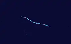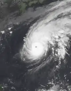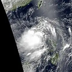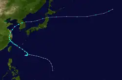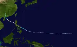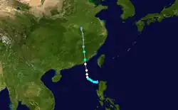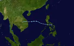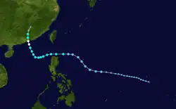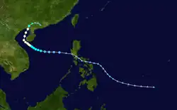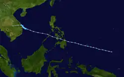 A tropical wave was detected by the Joint Typhoon Warning Center on August 24. On August 25, it was classified as Tropical Depression 12W by the JTWC.[10] The Japan Meteorological Agency (JMA) also upgraded the disturbance to a tropical depression later that day.[11] At the same time, the Philippine Atmospheric, Geophysical and Astronomical Services Administration (PAGASA) named 12W, Gening from its list of pacific typhoon names.[12] On August 26, Gening intensified into a tropical storm and was named Kent by the Joint Typhoon Warning Center.[10] Kent then quickly intensified into a typhoon on August 27 as it drifted slowly west-northwest. It quickly intensified and reached peak intensity as a Category 4 super typhoon on August 29. The storm also reached a low barometric pressure of 945 millibars during that time.[10] Continuing west-northwest, the eye of Typhoon Kent passed over the Philippine island of Basco. Kent then undergo an eyewall replacement cycle later that day and started to weaken. Kent also weakened below super typhoon status as it accelerated towards China.[10] Kent made landfall in China on August 31 50 miles (80 km) northeast of Hong Kong. After landfall, the Joint Typhoon Warning Center issued its final warning on September 1 as Kent dissipated.[10] The Japan Meteorological Agency also issued its final advisory on Kent.[11]