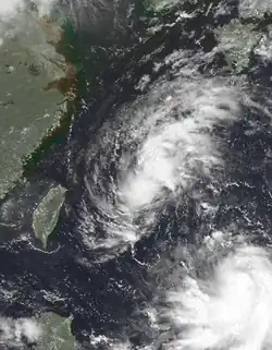 An active monsoon trough developed Tropical Storm Janis, forming on August 17 and becoming a tropical storm on the 21st. Another tropical depression to Janis's west merged with the storm, weakening it rather than the typical strengthening after a merger. Janis continued northwestward, eventually restrengthening to a 65 mph tropical storm before hitting eastern China. It recurved to the northeast, and hit near Seoul, South Korea, on the 26th. The storm brought more rain to an area hit by a typhoon only a month before, causing an additional 45 deaths and $428.5 million in damage.