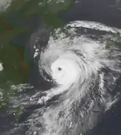 Tropical Depression 05W formed on July 15 and was named Faye the next day as it intensified into a tropical storm. On July 19, Faye became the first typhoon of the season, tied for the second latest date of the first typhoon with 1977, only behind Otto of 1998. It tracked northwestward and eventually reached a peak of 120 mph (190 km/h) 1-min winds and a minimum pressure of 950 millibars. Faye turned northward, and after weakening slightly it hit the south coast of South Korea on the 23rd, before accelerating east-northeastwards and becoming extratropical.[5] 16 people were reported dead, with moderate damage from flooding.[6]